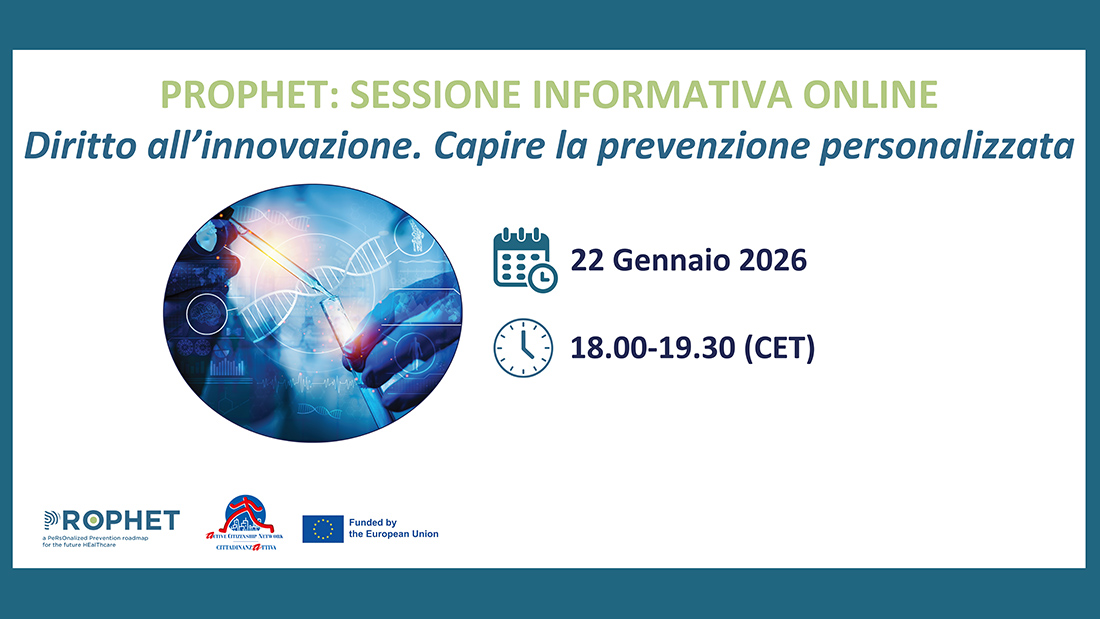 Giovedì 22 gennaio, dalle 18:00 alle 19:30, non perdere l'incontro online: "Diritto all'innovazione: comprendere la prevenzione personalizzata". In 90 minuti, con un linguaggio semplice e esempi reali, esploreremo cos'è la prevenzione personalizzata, perché è importante per ogni cittadino, e come viene sviluppata nell'ambito del progetto PROPHET. Esamineremo esempi conosciuti (cancro al seno, rischio cardiovascolare, vaccinazioni mirate) e delle novità come l'idea di un "passaporto genetico/farmacogenetico". Ci farebbe molto piacere avervi con noi: più siamo, più impariamo.
