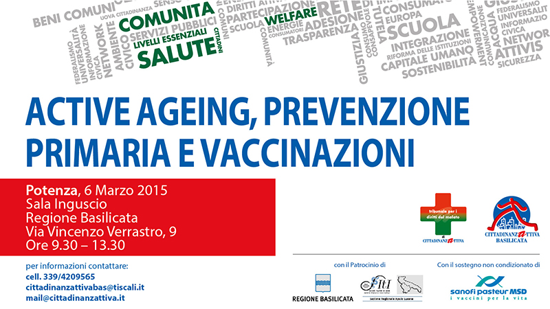 Il 6 marzo si terrà a Potenza uno degli appuntamenti regionali "Active ageing, invecchiamento attivo, vaccinazioni" promossi da Cittadinanzattiva con il sostegno non condizionato di Sanofi Pasteur MSD, che prevede una serie di tappe nei territori per avviare un confronto tra istituzioni, professionisti socio-sanitari, società scientifiche e cittadini in tema di invecchiamento attivo, prevenzione primaria e vaccinazioni.