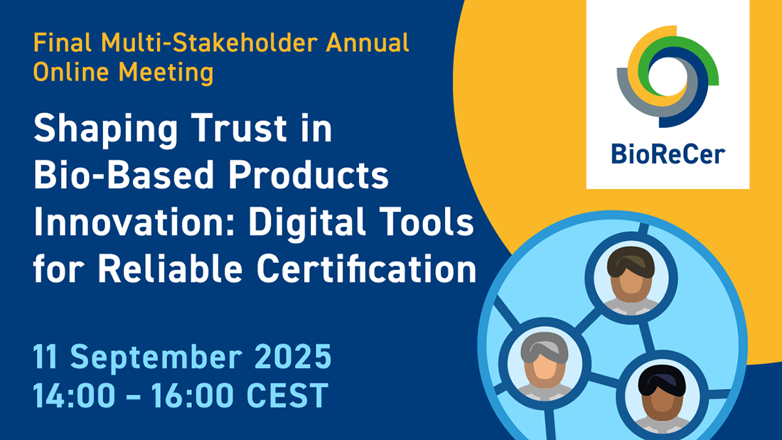 Vuoi scoprire come le innovazioni digitali possono rendere più sicura e trasparente la certificazione dei prodotti bio-based? Non perdere l’occasione di partecipare all’incontro online multi-stakeholder di BioReCer, il progetto europeo che lavora per rafforzare la fiducia nelle risorse biologiche attraverso una certificazione più attenta e strumenti digitali innovativi.