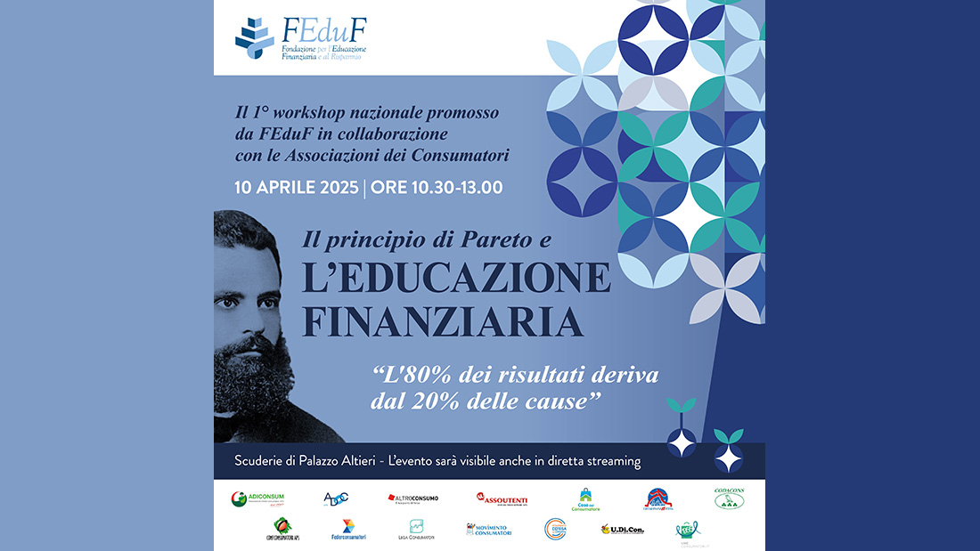 L’incontro dal titolo “Il principio di Pareto e l’educazione finanziaria” si propone di offrire un’occasione di confronto sull’applicazione del principio di Pareto all’educazione finanziaria: l’80% dei risultati deriva dal 20% delle cause, ovvero una piccola percentuale di cause può generare grandi effetti.