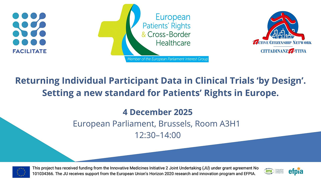 Il 4 dicembre portiamo il progetto europeo FACILITATE, di cui siamo partner, al Parlamento europeo con un evento speciale: “Returning individual participant data in clinical trials ‘by design’ — verso un nuovo standard per i diritti dei pazienti in Europa”, ospitato dall’eurodeputato Vytenis Andriukaitis. Parleremo di come restituire ai partecipanti agli studi clinici i propri dati possa conferire maggiore potere alle persone, migliorare la comprensione della salute e rendere la ricerca più etica e trasparente.