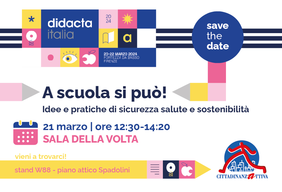 Sta per cominciare la nuova edizione della Fiera DIDACTA, uno degli eventi più importanti per il mondo dell'istruzione. Quest'anno la fiera si terrà a Firenze dal 20 al 22 marzo 2024 e siamo emozionati di annunciare che anche quest'anno noi di Cittadinanzattiva saremo presenti con uno stand al terzo piano insieme alle altre associazioni del terzo settore, pronti a parlare dei programmi che portiamo avanti nelle scuole di ogni ordine e grado, rivolti a docenti e studenti. Sarà un'occasione unica per discutere dei temi che ci stanno a cuore e per confrontarci con i professionisti del settore.