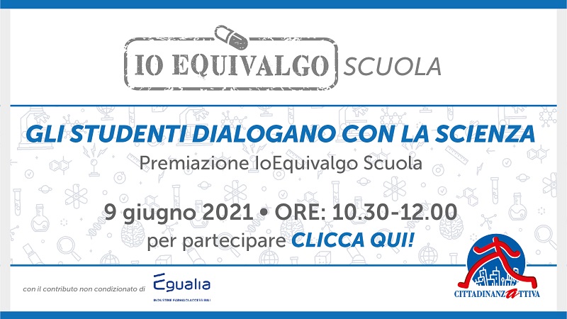 Ioequivalgo si è inoltre confrontata con il mondo della scuola attraverso un’edizione (2020/2021) dagli esiti assai apprezzabili, svoltasi a cavallo dell’emergenza pandemica. Ioequivalgo scuola - destinato alle scuole secondarie di secondo grado - ha visto la luce in Campania, Lazio, Umbria e Piemonte, con studenti, docenti e rappresentanti del mondo scientifico impegnati in laboratori e momenti di confronto sull’uso consapevole dei farmaci, la loro produzione e il loro ciclo di vita, la prevenzione primaria, il progresso scientifico e il rispetto dell’ambiente. Gli studenti hanno poi preso parte ad un contest che ha previsto la creazione di video spot ( videospot 1 e videospot 2) sull’uso corretto dei farmaci, video votati sui social e poi premiati in un evento molto partecipato.